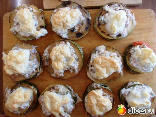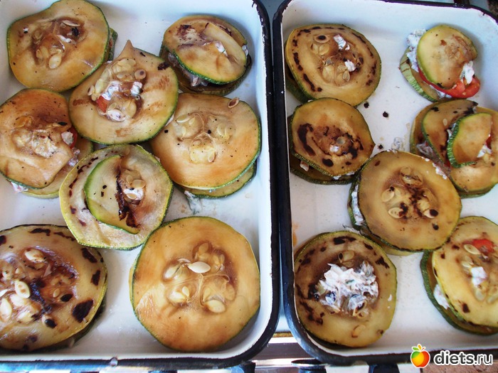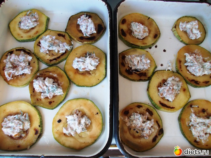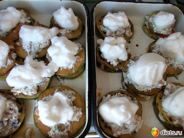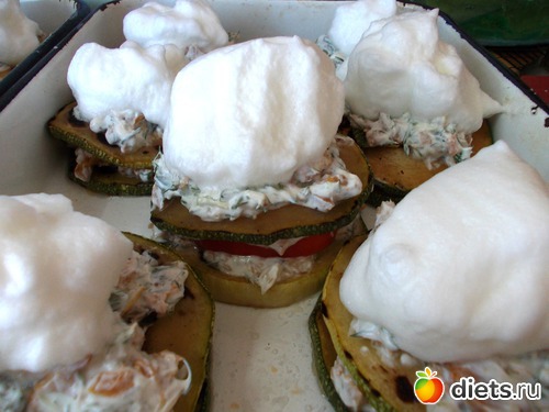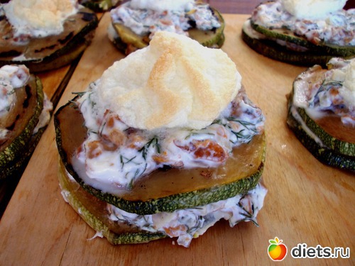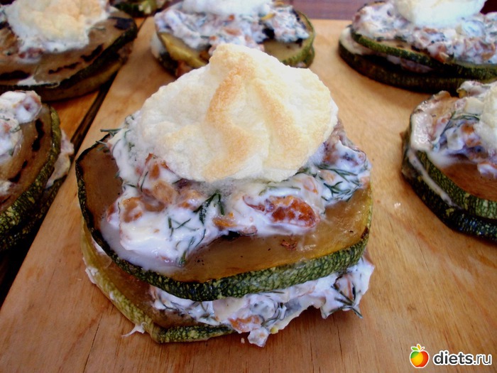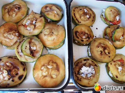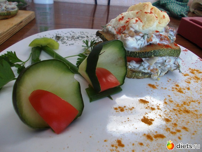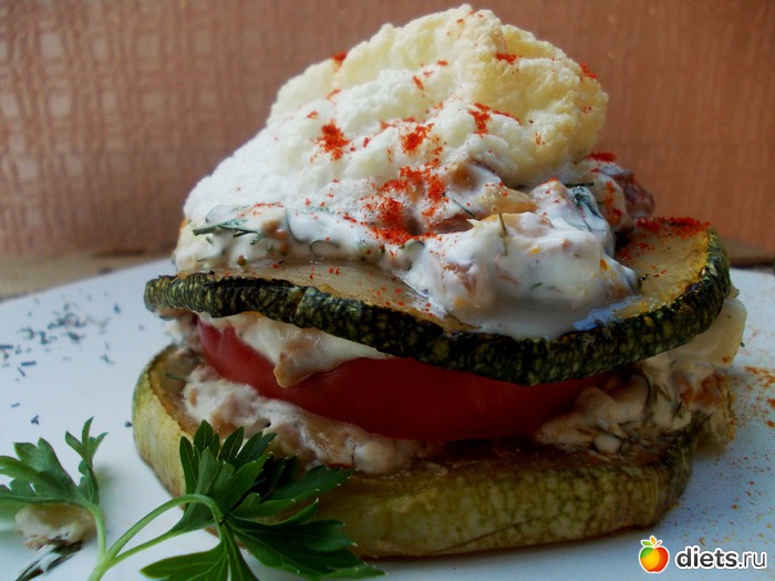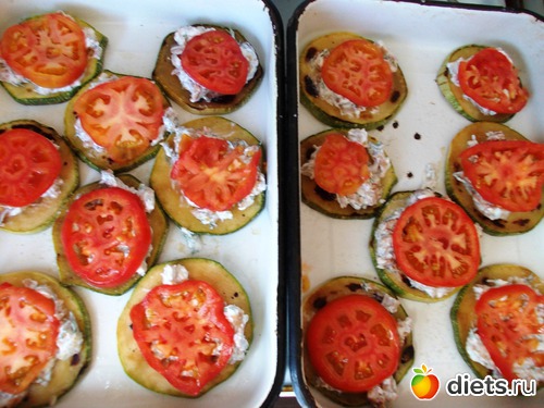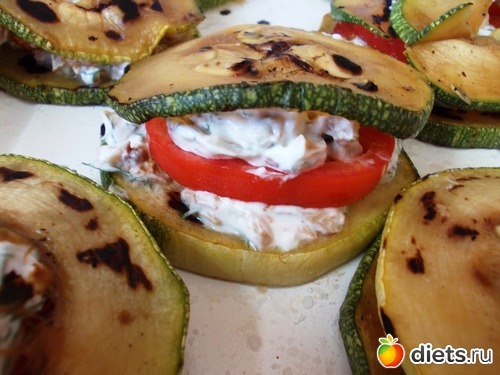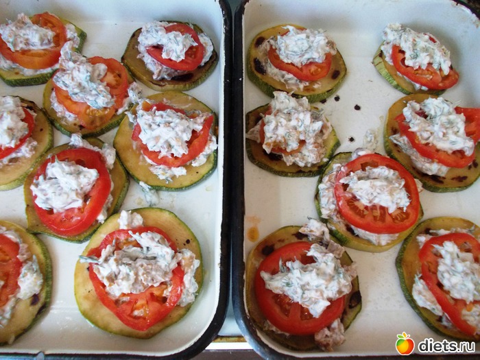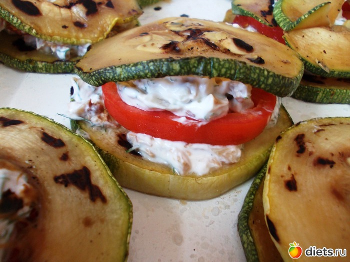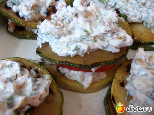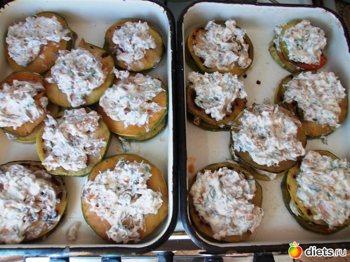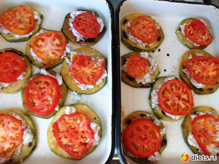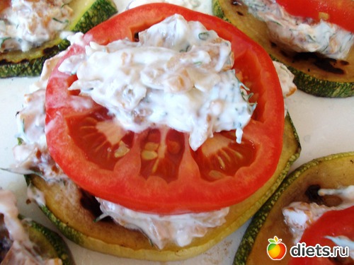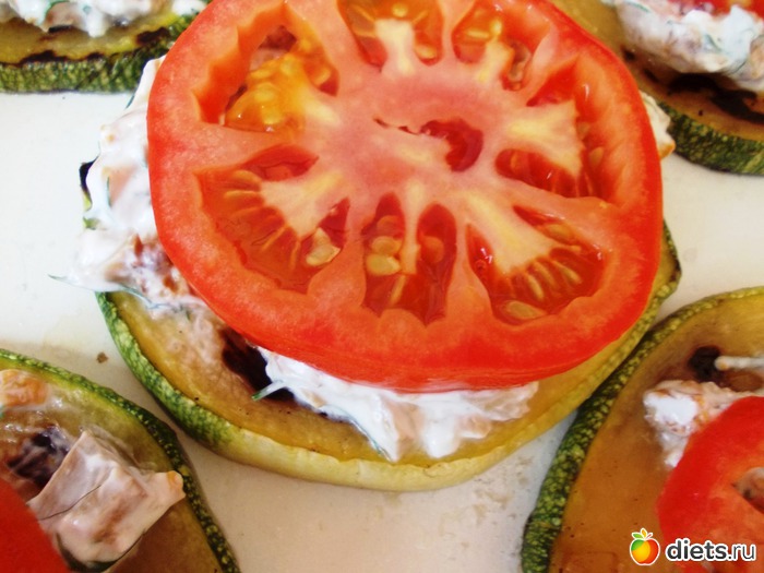 Так что накладываем кружки кабачка, томата и соус строго один на один, в таком порядке: