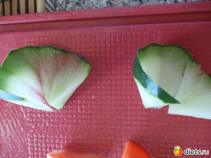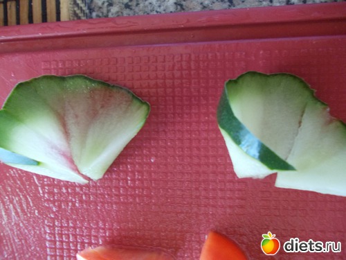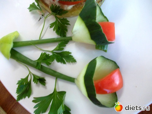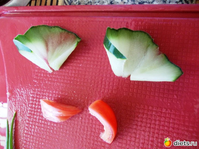 На украшение нам понадобится:немного огурца, томата, пёрышки лука и петрушка...