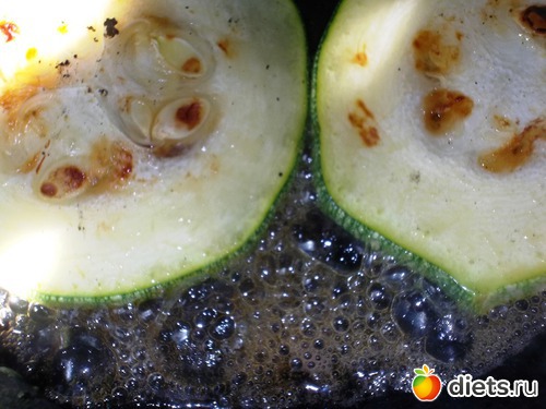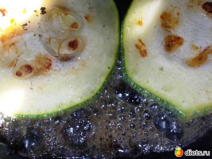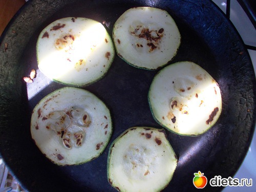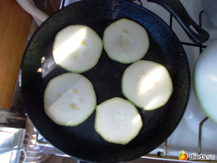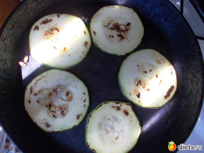 Нагреть чугунную или тефлоновую сковороду (без масла) выложить кружки кабачка и обжарить на среднем огне (кабачок не солить)