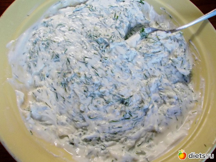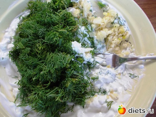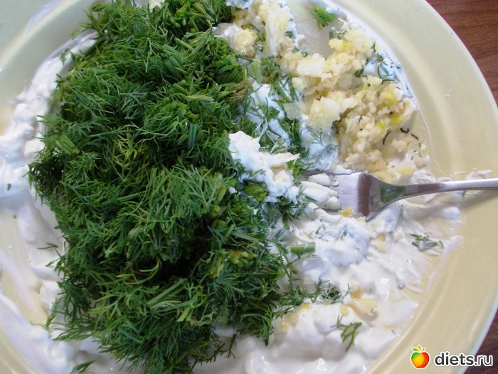 Творог разминаем вилкой или пробиваем блендером, доводим водой до консистенции густой сметаны. Нарезаем пучок укропа. Добавляем в творог.
