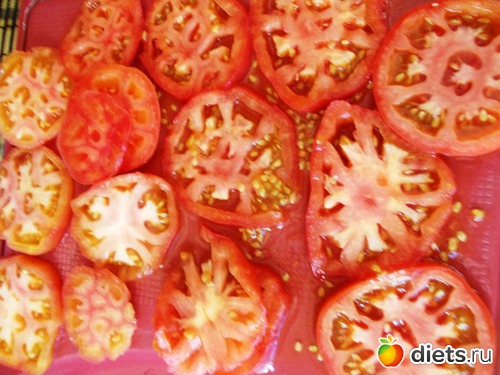 Нарезаем томаты на 15кружочков Можно кожицу убрать, для этого опустить на 30сек. в кипящую воду
