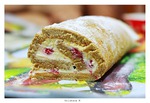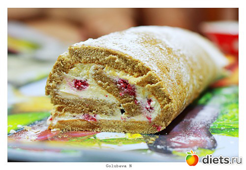 На столе расстелить бумагу, посыпать её сахарной пудрой или сахаром. Снять полотенце с нашего коржа, перевернуть корж на бумагу посыпанную сахарной пудрой или сахаром. Аккуратно снять сверху пергаментную бумагу, обрезать затвердевшие края у коржа (0,5 см), промазать кремом корж и выложить малину (вишню) по всей поверхности и свернуть аккуратненько в рулет. Поставить в холодильник остывать часа на два.