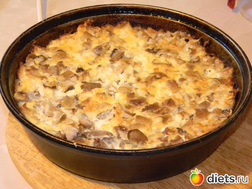 Грибы отварите. Лук и грибы нарежьте кубиками, добавьте творог, сыр, 2 яйца и 1 белок(1 желток оставить для смазывания), посолить и поперчить. Все перемешать и выложить в форму. Сверху смазаь взбитым желтком. Выпекать 25-30 мин.
