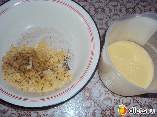 Сыр натереть на крупной тёрке, добавить тмин, кориандр, выдавленный чеснок, поперчить.