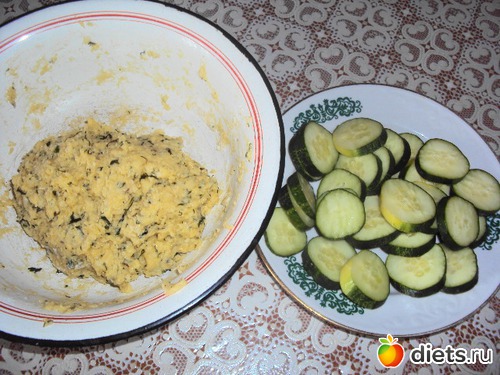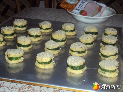 Замесить тесто, оно должно быть немного вязким и липковатым. Огурчики порезать на колечки,