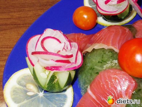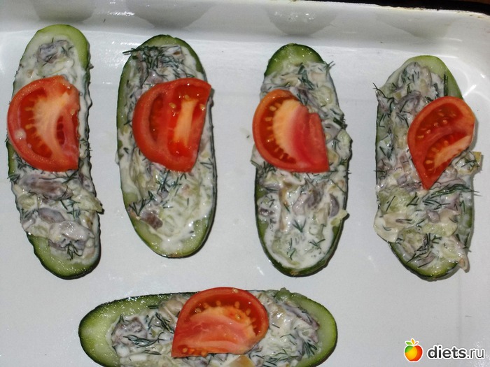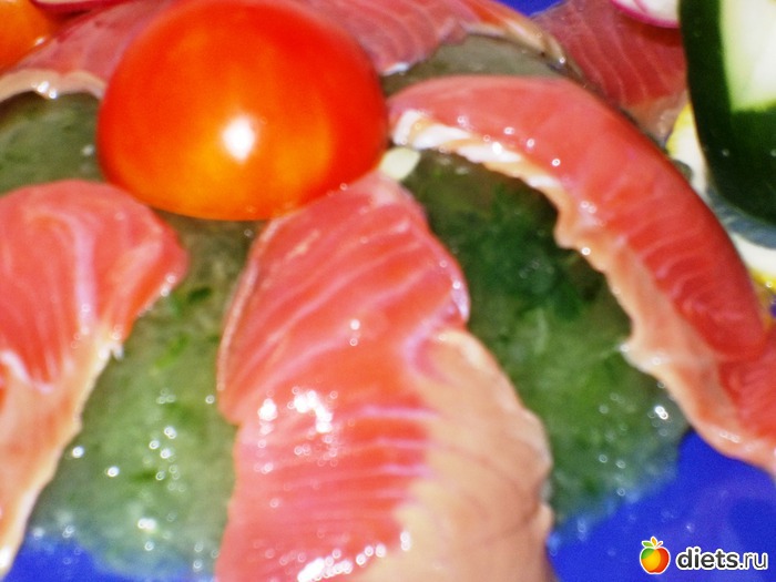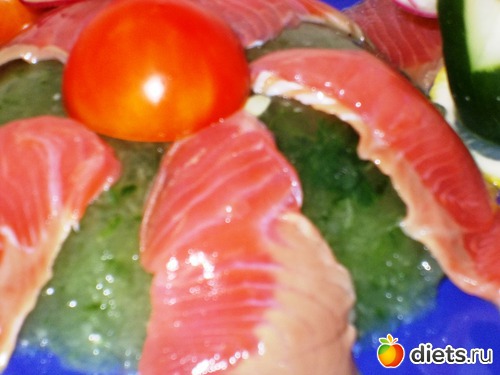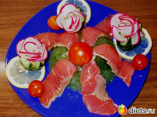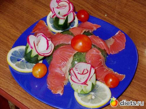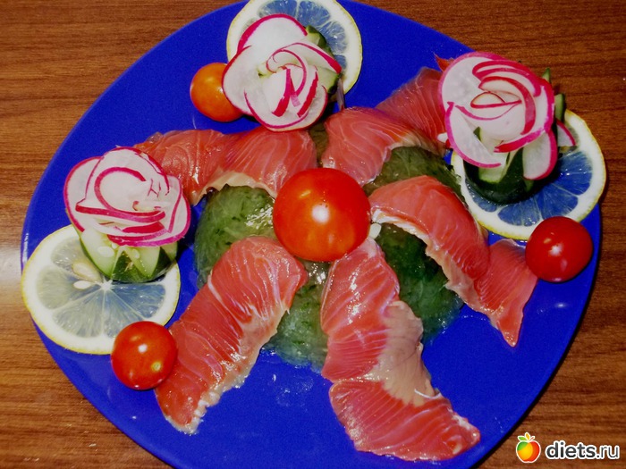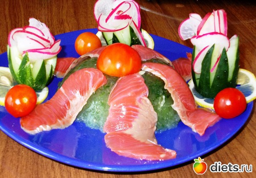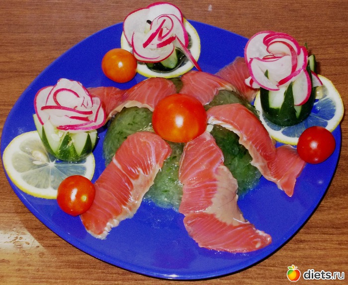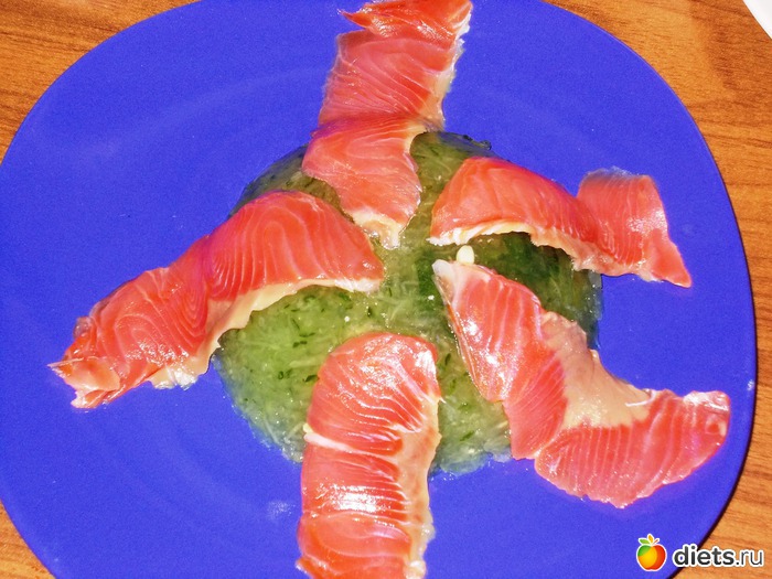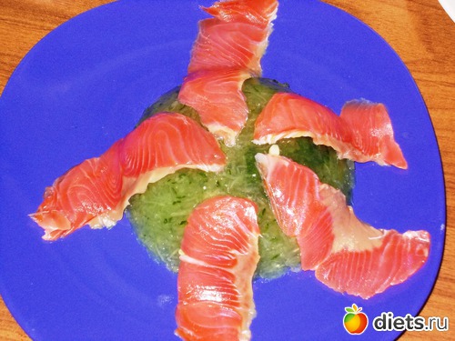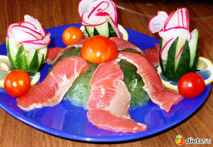 Сочетание желированного свежего огурца и солёной рыбки представляется вкусным.
