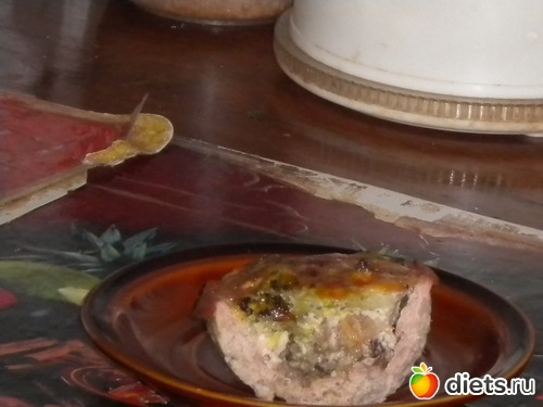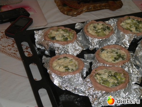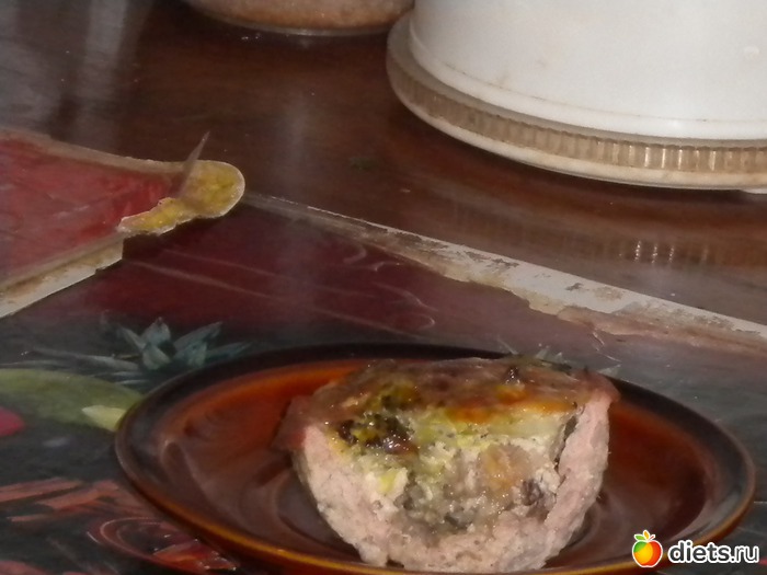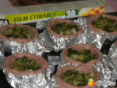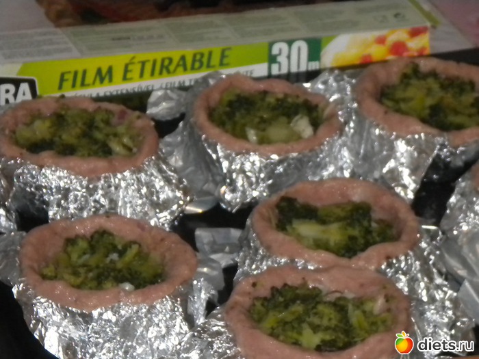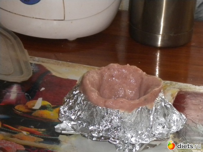 Чайные чашки выстелить фольгой(по рецепту в 4 раза, но моя жлобская натура сделала и в два раза). Легонько смазать маслом. Фарш распластать по формочке, вынуть из чашки, поставить на лист