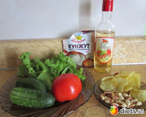 Капусту или листья салата рвем руками, нарезаем помидор дольками, огурец - не очень крупными брусочками. Делаем заправку: смешиваем уксус, масло, соль, сахар и перец (Если есть, можно добавить немного кунжутного масла. Тогда количество оливкового следует сократить). Полученной заправкой поливаем салат и даем ему настояться в холодильнике несколько минут.