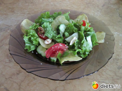Перед подачей на стол в салат добавляем арахис и чипсы. Кстати, чипсы лучше брать без вкусовых добавок. Сверху салат посыпаем кунжутом.