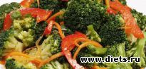 Перец нарезать полосками шириной примерно с палец. Слегка обжарить его на сковородке (до мягкости) и выложить в тарелку. Миндаль мелко порубить. Нарезать брокколи (не слишком мелкими кусочками) и тоже обжарить (если она мороженая). В том случае, если капуста свежая, ее лучше предварительно потушить на небольшом огне минуты 2-3, а уже после этого обжарить до мягкости. Салат из брокколи лучше всего делать вообще без растительного масла, но если вы на нем поджаривали, то нужно дать маслу стечь в отдельной тарелочке.
