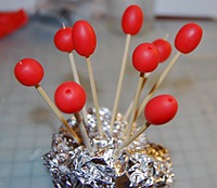 Итак, допустим, вам для вашего изделия не хватает красных бусин. Вместо того, чтобы ехать по магазинчикам, высматривая бусины нужного размера, можно просто взять упаковку полимерной глины, Шарики из фимоотрезать небольшой кусочек, хорошенько его размять и скатать бусины необходимого размера, формы и цвета, как из обычного пластилина. Затем аккуратно проколоть в бусинах дырочки иголкой или зубочисткой, и на этих же зубочистках, воткнутых в комок фольги или картонную коробку (из-под чая, например), отправить в духовку на 20-30 минут при температуре 110-130С (строго следуйте инструкции на упаковке вашей пластики).