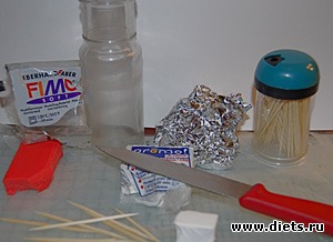Для того, чтобы сделать бусины своими руками, вам понадобится только брикетик пластики нужного цвета, лист вощеной бумаги, чтобы выстелить им рабочую поверхность, небольшая скалка (можно использовать тонкую узкую бутылку), чтобы раскатывать и разминать пластику, рабочий ножик (не используйте его только потом для приготовления пищи), подойдет и простой канцелярский, и духовка, способная поддерживать температуру 110-130С. Пригодятся кусок фольги и зубочистки для удобного запекания бусин. Желательно обзавестись отдельным специальным термометром для духовки, чтобы быть точно уверенным в температуре, к которой пластика очень чувствительна. Нельзя допускать перегрева - нетоксичная сама по себе полимерная глина при температуре выше 130С начинает гореть и выделять токсичные газы. Если нет духовки, все виды пластики, кроме "Цветика" можно варить в кипятке. Только отметьте два момента - изделия будут получаться чуть менее прочными, чем в духовке; и емкость, в которой варилась пластика не рекомендуется использовать затем для приготовления пищи.