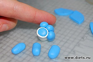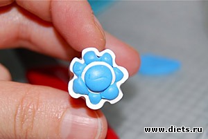 Из основного цвета (здесь голубого) формируем простую одноцветную колбаску и разрезаем на семь одинаковых частей длинной по 1.5 - 2см. Из одного маленького брусочка делаем сердцевинку цветка - обворачиваем его полоской контрастного цвета: