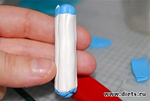 Собирать рисунок нужно так, чтобы между слоями и кусочками пластики не было воздушных карманов, дырок. Частично воздух уйдет, и дырки заполнятся пластикой при дальнейшем уменьшении колбаски: