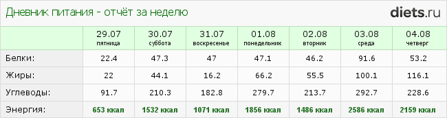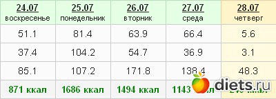 На море я умудрилась отравиться.. и вот этот второй недельный отчет - это практически все питание после отравления.. Есть и скромные деньки, а есть и откровенные зажираловки (может, КД повлияло)..