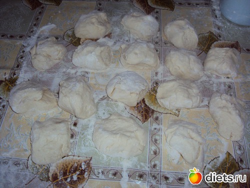 Тесто выложить на стол, присыпанный мукой, разделить на 16-18 одинаковых кусочков.