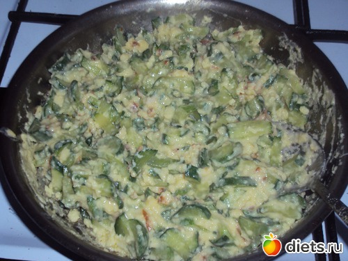 Добавить к яичной массе тёртый сыр, перемешать ложкой и вылить в огурцы.