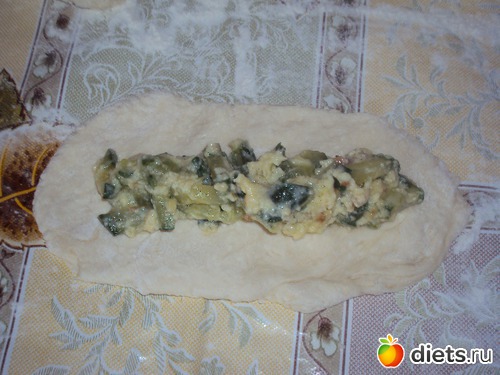 Каждый кусок теста раскатать или примять руками на столе ввиде прямоугольника, положить начинку и защипать.