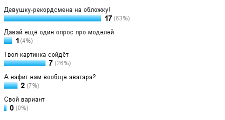 Второе (банальное) - выбрать несколько фоток красивых моделей и устроить голосование. Фотка, набравшая самое большое количество голосов, пойдёт на аватару!