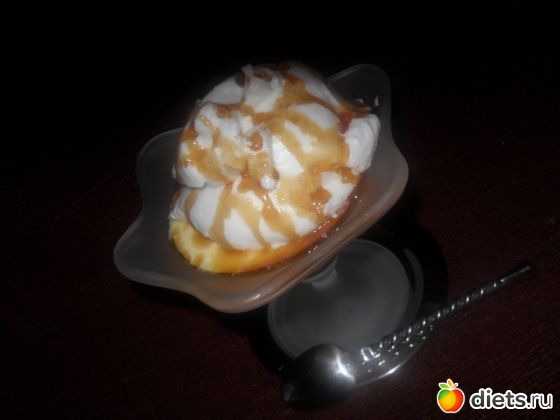 На шарики мороженного, даже бесформенные, так как после их надо будет оставить стечь. Главное хорошо их взбить, чтобы получилась сплошная пена.