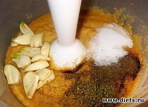 Затем добавить чеснок, соль, специи и еще хорошенько пробить до однородности.