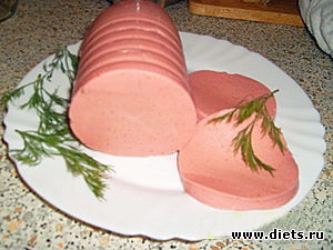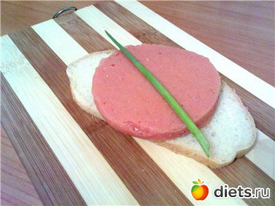 После полного охлаждения и застывания гороховой смеси бутылку взрезать, развернуть, извлечь получившуюся вегетарианскую гороховую колбасу и порезать ее ломтиками.