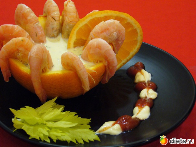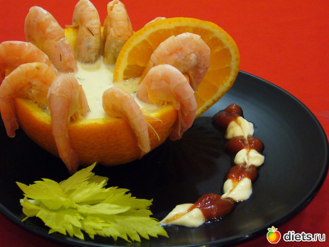 Апельсиновые "розеточки" украсила креветками и залила в них мой соус.