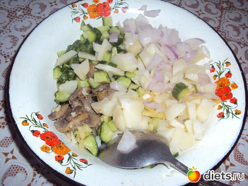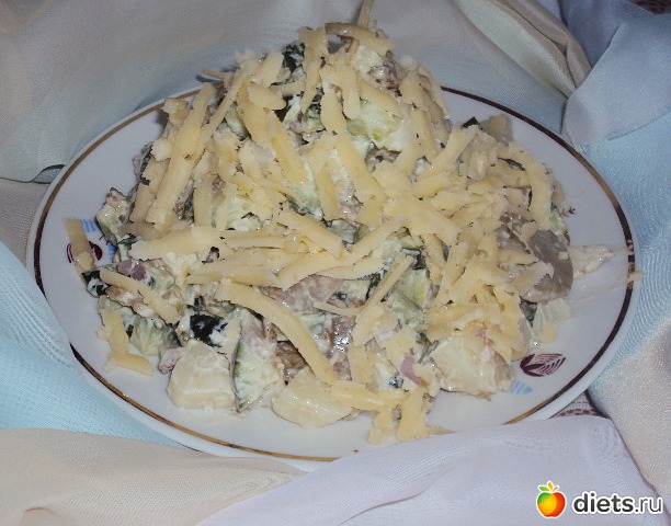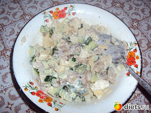 Ну очень вкусный и сытный салат, а грибной аромат и свежесть огурчика просто покоряют своим вкусом!