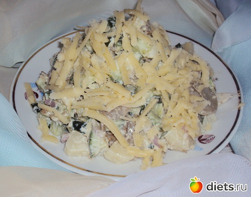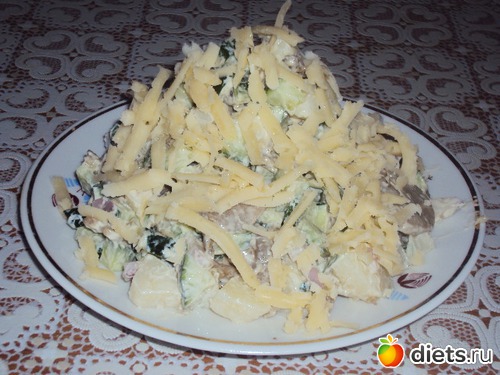 Салат выложить горкой на блюдо и перед подачей посыпать тёртым сыром.