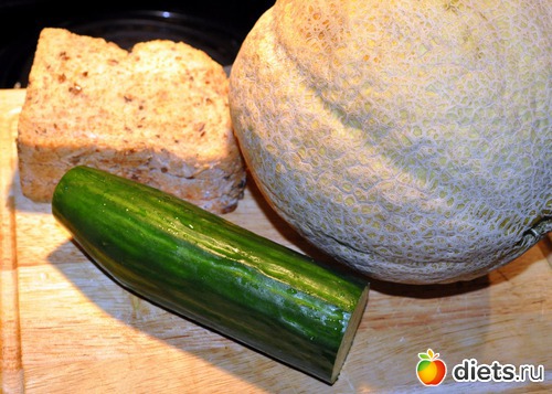 Сначала приготовим дыню, огурец и порезанный хлеб. Я взяла зерновой с отрубями.