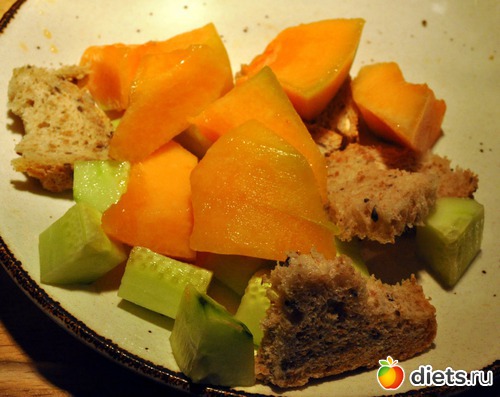 Очистим дыню и огурец от кожуры, и порежем. Хлеб порежем или покрошим.
