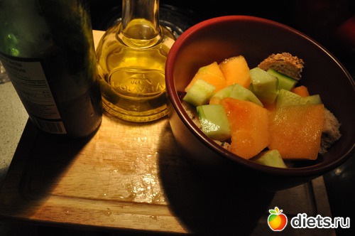 В миску с порезанными огурцом, дыней и хлебом добавим 2 ст ложки оливкового масла и 1 ст ложку уксуса бальзамического или яблочного. Оставим пропитаться на час