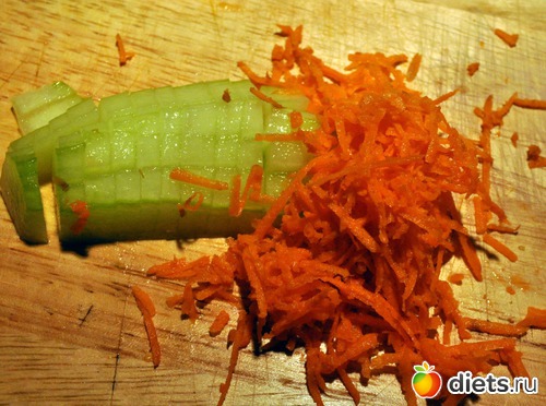 Отдельно мелко порежем огурчик и протрем морковь для сервировки