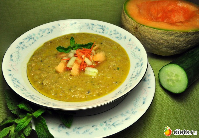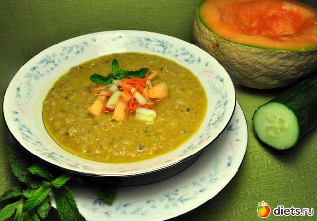 Дорогие Девочки, приглашаю отведать вкусный холодный суп, прекрасный для летнего дня, так как его краски напоминают мне теплоту августа и он и насытит и освежит. В то же время мало калорий, что важно для нас, стремящихся похудеть и оставаться прекрасными и неотразимыми всегда. Огурец и дыня - оказывается прекрасная семья вместе и сочетание восхитительно.