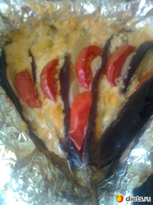 На обед в 13 часов - баклажан, запеченый с сыром гауда и овощами (про бульон забыла, пила чай)