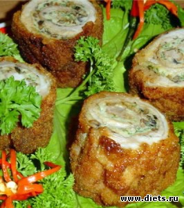 Рулет скалываем зубочистками, панируем его в муке, яйце, сухарях и обжариваем во фритюре 10 минут.