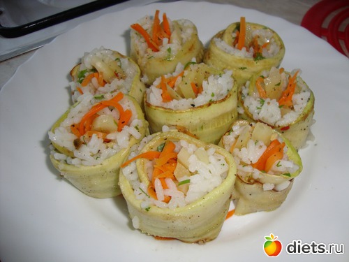 На пластинку кабачка выложить рис. С одного конца – мягкий сыр, сладкий перец или морковь по-корейски.