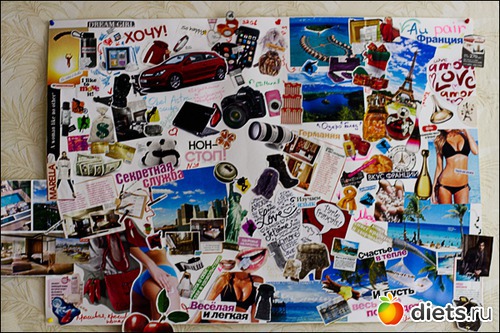 И второе. Про мотивацию. Еще в январе я сделала себе карту желаний, многое уже отмечено галочками на ней, как сбывшееся. Так получается, что утреннюю гимнастику я делаю не перед зеркалом (этого и в зале хватает, когда танцую! а дома только новые связки перед зеркалом учу), а перед стеной, и карта у меня все время перед глазами. А когда пресс качаю в паузах на нее любуюсь. А там - мотивашки мои с попой, грудью и животиком!