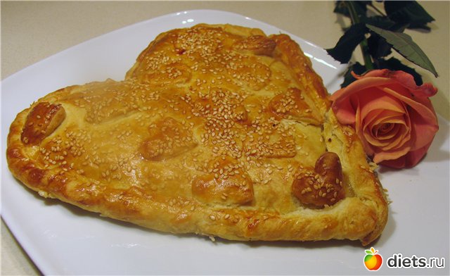 Купила тесто слоёное, слегка разморозила его, разделила на две части, посыпала стол мукой, раскатала сперва одну часть в пласт и вырезала сердце, затем положила на тесто начинку и раскатала вторую часть в пласт, вырезала сердце и первый пласт с начинкой, накрыла вторым пластом без начинки и защипнула края.