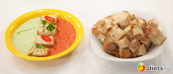 Способ приготовления: для томатного гаспачо в блендере взбить в однородную массу нарезанные помидоры, соус табаско, уксус и томатный сок. Посолить. При отдельной подаче украсить базиликом и полить оливковым маслом. Для огуречного гаспачо в блендере взбить нарезанные огурцы, сметану, чеснок и кинзу. Посолить. Чтобы подать оба варианта гаспачо на одной тарелке, надо аккуратно с разных сторон вливать супы так, чтобы они не перемешались, и между ними сохранилась четкая граница. При подаче украсить кусочками чиабатты и слегка полить оливковым маслом.
