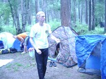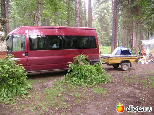 с прицепом. Загрузили мы свои палатки, рюкзаки и баулы, с одеялами и тёплыми вещами. Только сели в автобус, мужики наши:Ну давайте. Стали розливать и передавать рюмки с веселительным зельем(малиновая настойка). Я сидела сразу за водителем, он ругался на чём свет стоит, чтоб не пили, не сорили и т. д. Мне дают рюмку, чтоб передала пассажиру, котоый сидит рядом с водителем, я протягиваю руку, приговариваю:"Да мы аккуратно". КОЧКА, и содержимая жидкость летит водиле на рукав. Я ни жива, ни мертва, вжалась в кресло, А водила с этого момента перестал орать. Ехали 3-3,5часа. Народу, в Архызе отдыхает-великое множество, и дождь не помеха. Вдоль реки Зеленчук на несколько километров тянутся палаточные лагеря. Приехали, облюбовали поляну, разбили палатки и за шашлычёк