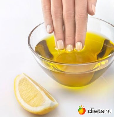 Берем растительное, оливковое, персиковое или любое другое масло, смешиваем их в произвольных пропорциях и слегка подогреваем на водяной бане. Добавляем по 1-2 капельке жидкого витамина Е и А, опускаем руки и держим 15-20 минут. Затем руки можно вымыть с мылом и нанести крем, а можно просто вытереть салфеткой и одеть хлопчато-бумажные перчатки (перед сном). Такая процедура защищает ногти от расслоения, питает ногтевую пластину и уберегает ее от высушивания.