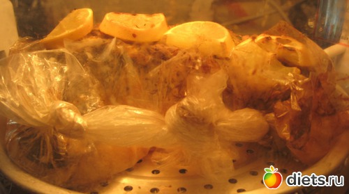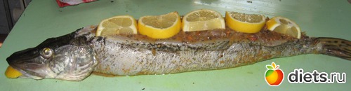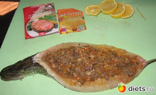 3. Прошиваем слегка по хребту нашу щуку и ложим половинки лимонов сверху