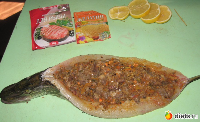 1. Вытягиваем хребет с щуки, разрезая ее через спину: от головы до хвоста вдоль с одной стороны спинного плавника острым ножом делаем надрез и с другой стороны делаем параллельно первому и отделяем хребет от филейной части. Ножницами перерезаем хребет у головы и хвоста, удаляем жабры и внутренности. Сбрызгиваем рыбу лимонным соком и специями со всех сторон