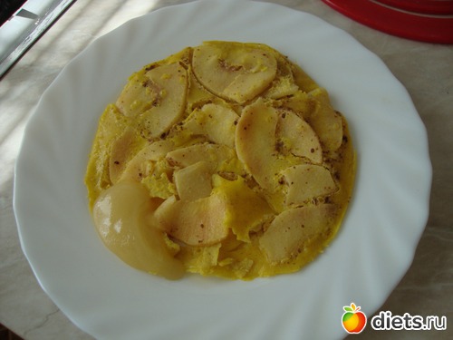 Наверное, рецепт писать не стОит. Добавлю только, что делала его на водяной бане, чтобы избежать использование масла. А так: 1 яблочко, 1 яйцо, 0,5ч. л. муки, 1ст. л. молока, корица и мёд.