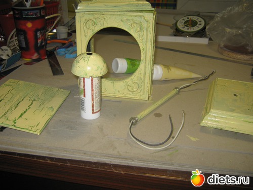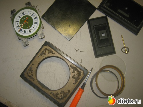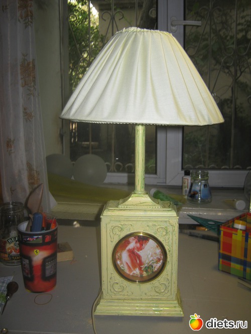 Когда-то давно нашла я на просторах интернета замечательную картинку, которою так мне хотелось куда-нибудь применить и вот настал ее час. Я распечатала ее, и вставила за стекло, на место старого циферблата (при желании, можно было бы и фотографию какую-нибудь памятную туда поставить, получилась бы лампа с фоторамкой, но мне очень хотелось применить картинку, уж очень она хороша) и принялась собирать из найденных и собранных по дому запчастей мою настольную лампу.