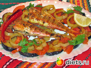 Ингредиенты: барабулька, петрушка, укроп, вино белое, лимон, баклажан, перец сладкий, перец острый, помидор, растительное масло, специи
