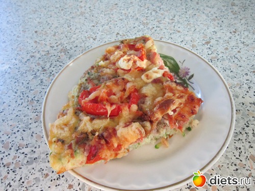 Калорийность 100 г блюда получилась 165 ккал. (напоминаю: я делала без майонеза и не использовала масла для смазки формы, а просто присыпала манной крупой). Получившуюся пиццу разделила на 4 порции, калорийность одной составила 178 ккал.