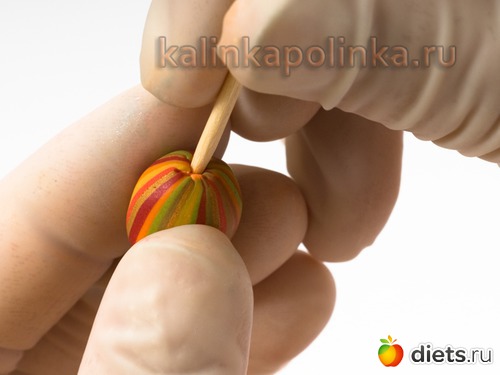 Стягиваю с концов, немного помогаю зубочисткой. Можно сразу сделать в этом месте дырочку.