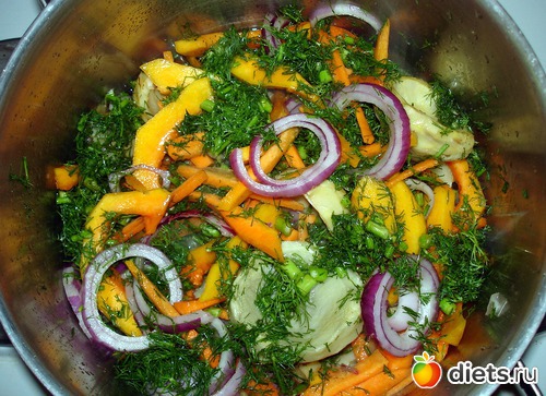 На дно наливаем немного воды и выкладываем артишоки. Поливаем их соком одного лимона, добавляем укроп, и закрываем крышкой. Затем добавляем тыкву, морковь, лук, масло, немного доливаем воды, ничего не перемешиваем, а лишь встряхиваем немного и закрываем крышкой, убавив огонь. Позднее немного солим и периодически по чуть-чуть доливаем воды. Совсем немного. Все должно тушиться в собственном соку.
